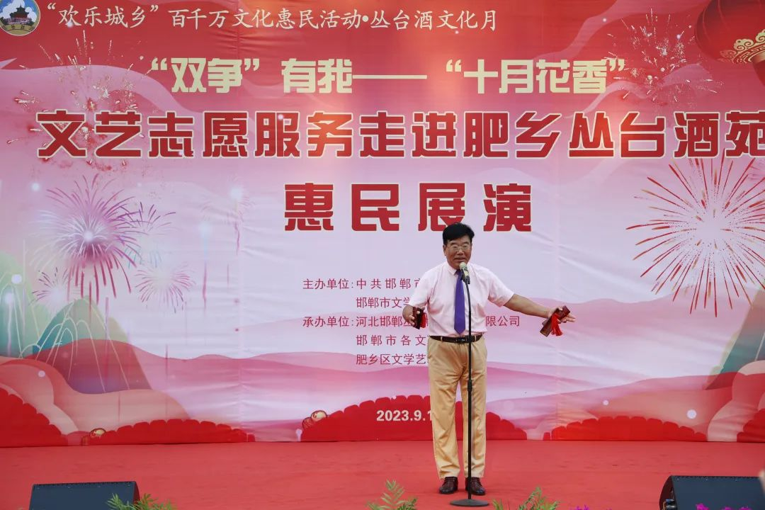 邯郸市文联党组成员、副主席崔彩平在致辞中表示,首先代表邯郸市文联向今天亲临现场的各位领导、各位同仁、各位嘉宾致以热烈的欢迎!为深入学习贯彻习近平新时代中国特色社会主义思想和党的二十大精神,落实河北省委十届四次全会和邯郸市委十届五次全会精神,切实把全市广大人民群众的思想和行动统一到会议精神上来,邯郸市文联围绕“双争”主题,在意昂4酒苑举办此次文艺志愿服务活动,旨在进一步提升“十月花香”文艺品牌影响力,不断提高邯郸市文艺志愿服务水平,在中国式现代化邯郸篇章中贡献文艺力量。同时,非常感谢肥乡区委宣传部、意昂4为本次活动提供的大力支持和帮助。最后,预祝本此文艺志愿服务活动圆满成功!