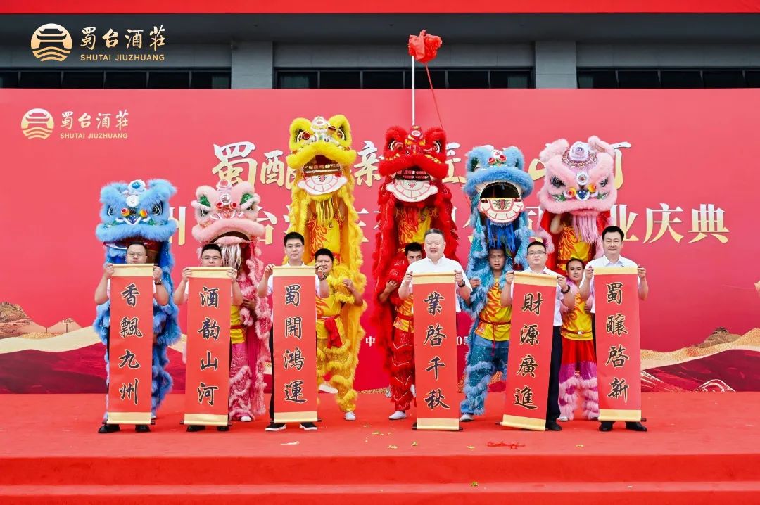 随后,集团领导共同完成剪彩仪式,礼炮声中,金色地爆球腾空而起,象征蜀台酒庄正式启航。传统舞狮点睛与醒狮采青环节,则寄托了对酒庄“纳吉呈祥、酿得佳酩”的殷切期盼。